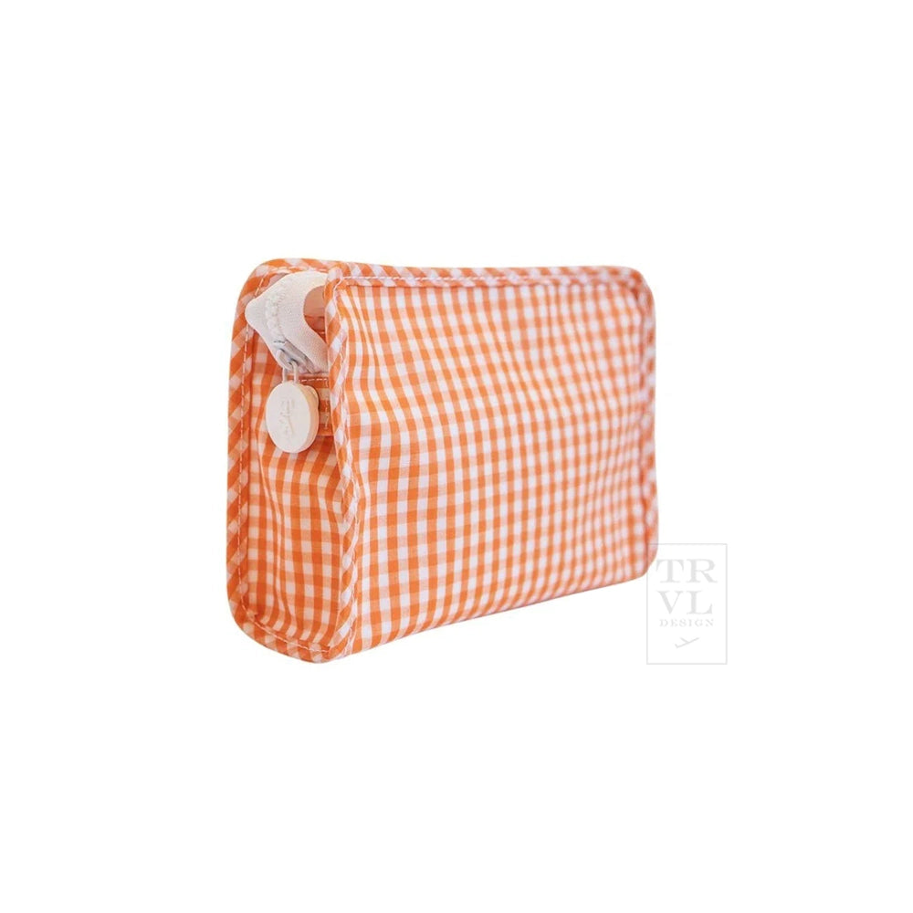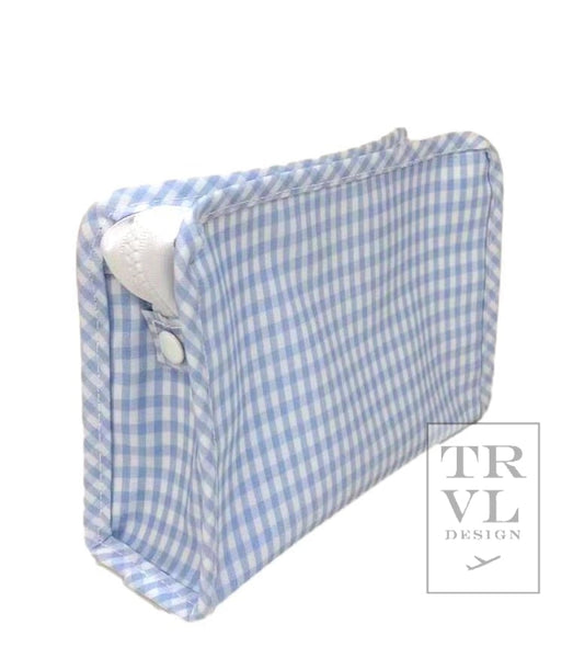 Our best-selling Roadies are our BFFs in the pouch world! Available in 3 sizes, our Small Roadie is made in a cotton gingham with a thin Eco-friendly matte coating, an inside slip pocket and exterior snap open zip tabs for a wider opening and an easier access. * Size: 7.5"l x 6"h x 2.25"d